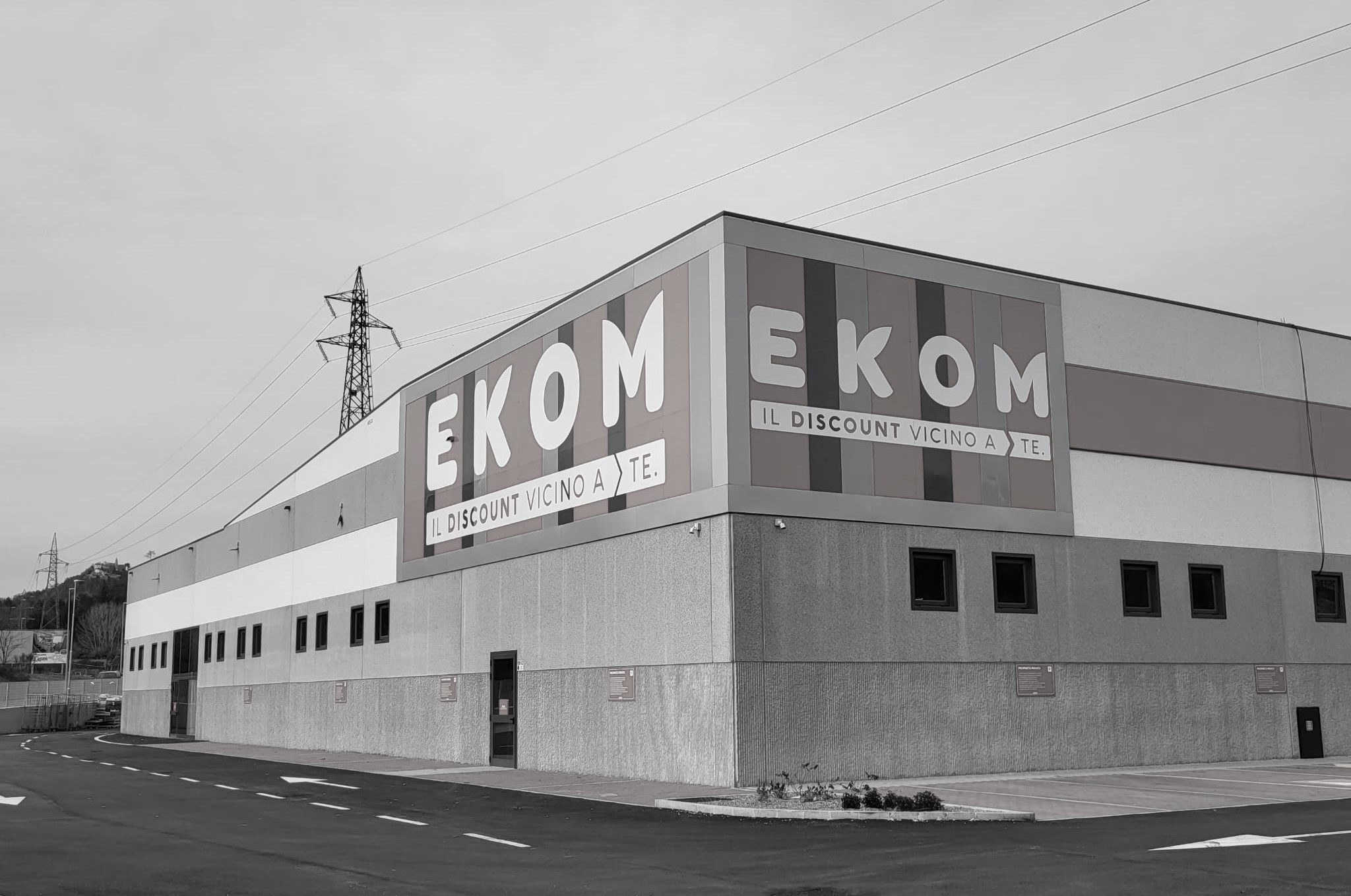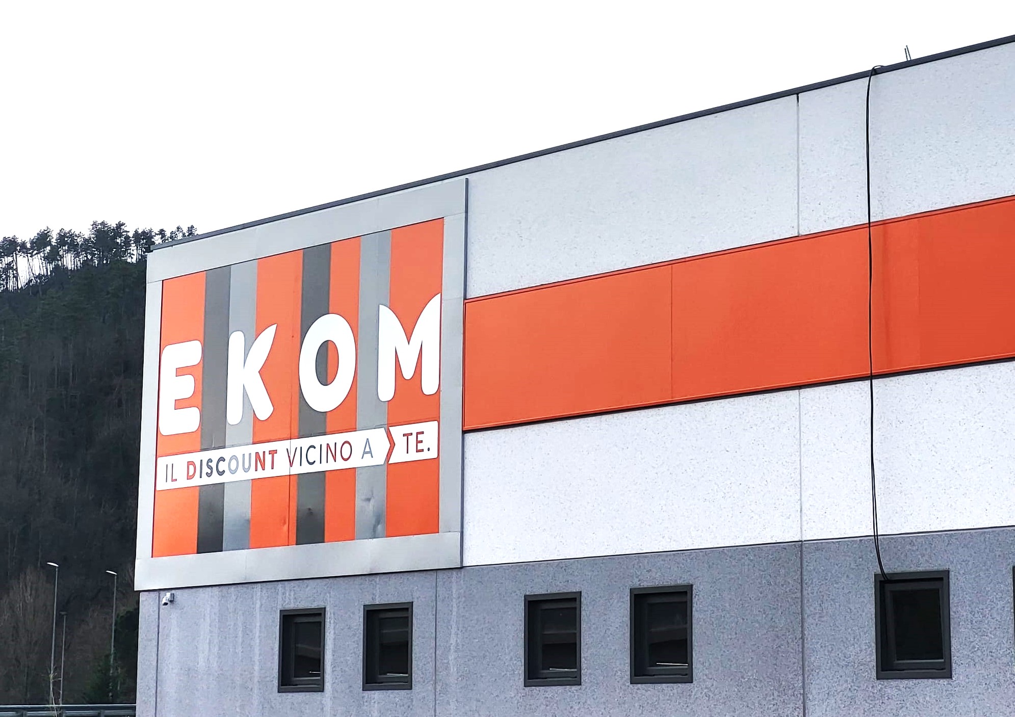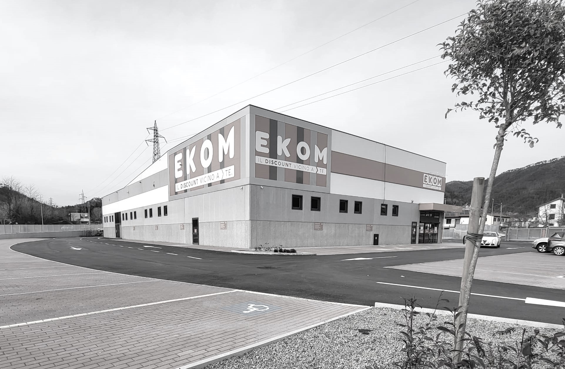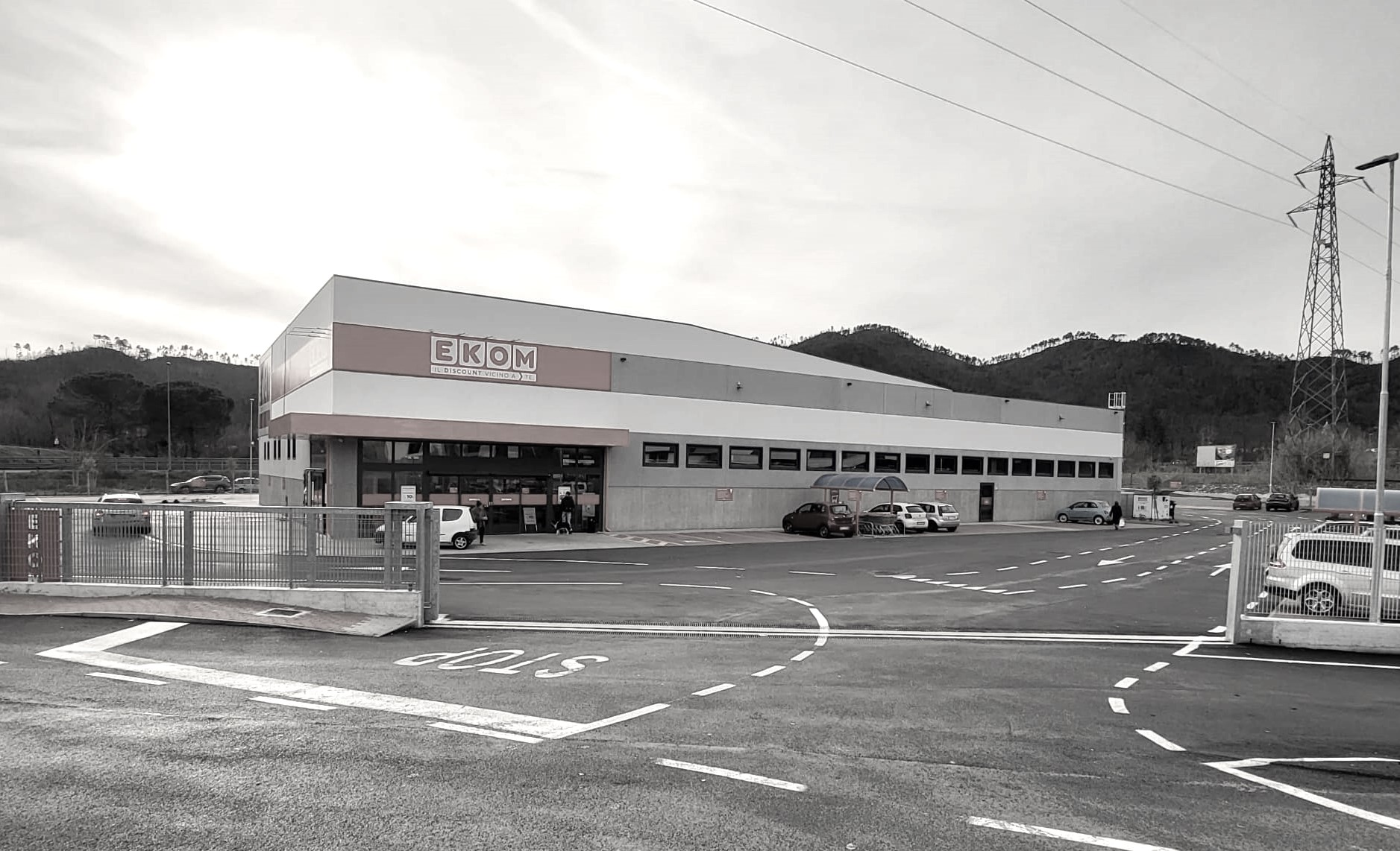 La nuova sede Ekom nel Comune di Brugnato si sviluppa su una pianta rettangolare con una superficie coperta di 1.466 mq circa in posizione baricentrica rispetto al lotto di proprietà e con un allineamento parallelo all’arteria Autostradale. L’allineamento seguirà pertanto le logiche compositive dell’adiacente centro commerciale Shopin 5 Terre che per dimensioni ed importanza urbana definisce in modo chiaro e univoco la maglia compositiva del tessuto urbano. L’impianto di progetto dal punto di vista architettonico è composto da un volume semplice arricchito da un elemento scenografico sul fronte parallelo all’arteria autostradale. Per quanto concerne il rivestimento dei prospetti è stato condotto uno studio cromatico volto alla realizzazione di una facciata dai caratteri rarefatti attraverso un trattamento che lavora in modalità espressiva per “pixel” con toni sfumati a bande orizzontali nelle tinte dei grigi.